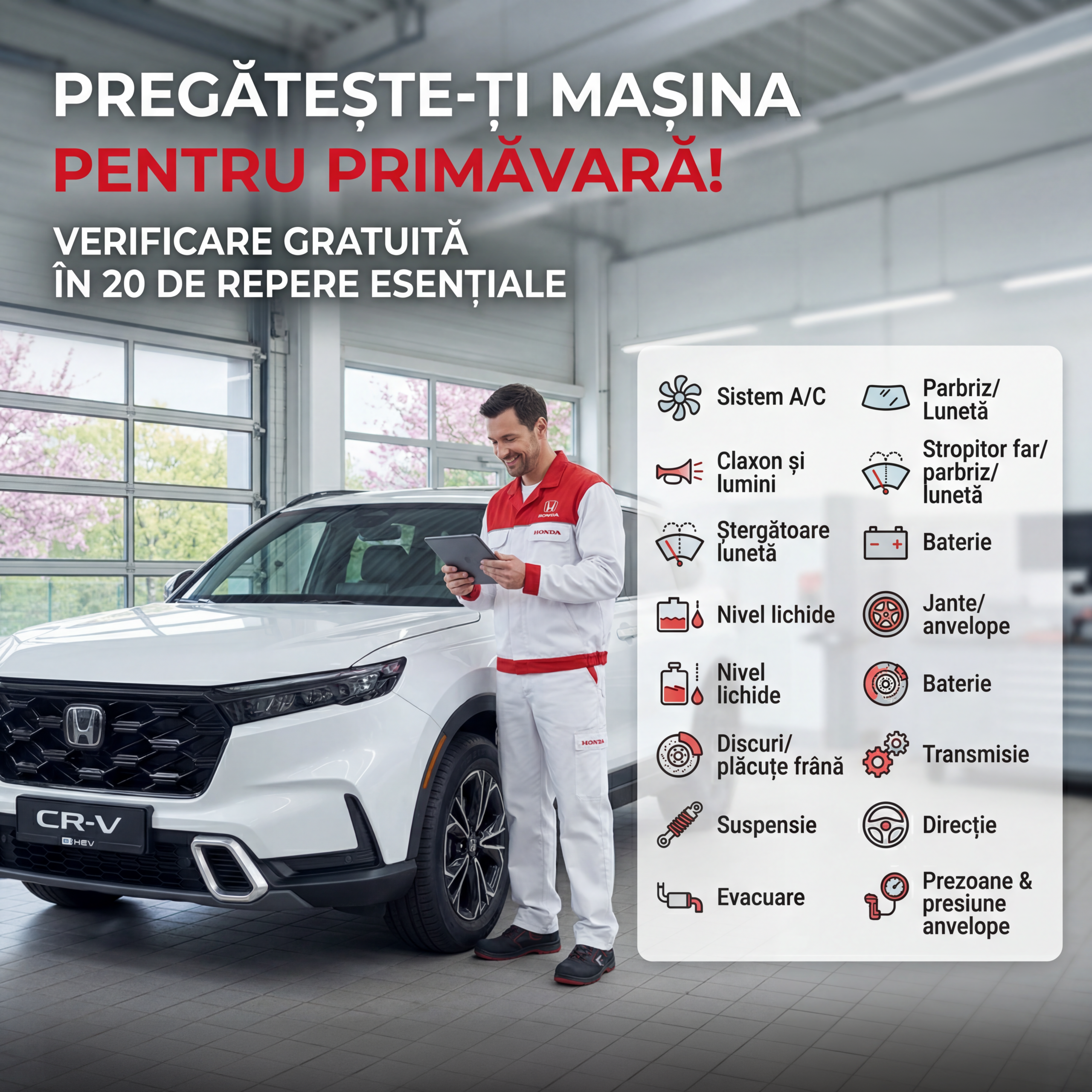 În perioada 10 martie – 10 aprilie, beneficiezi de verificare gratuită pentru 20 de repere esențiale, -20% discount la piesele de mentenanță și mecanică Honda, cât și 10% discount la manoperă.